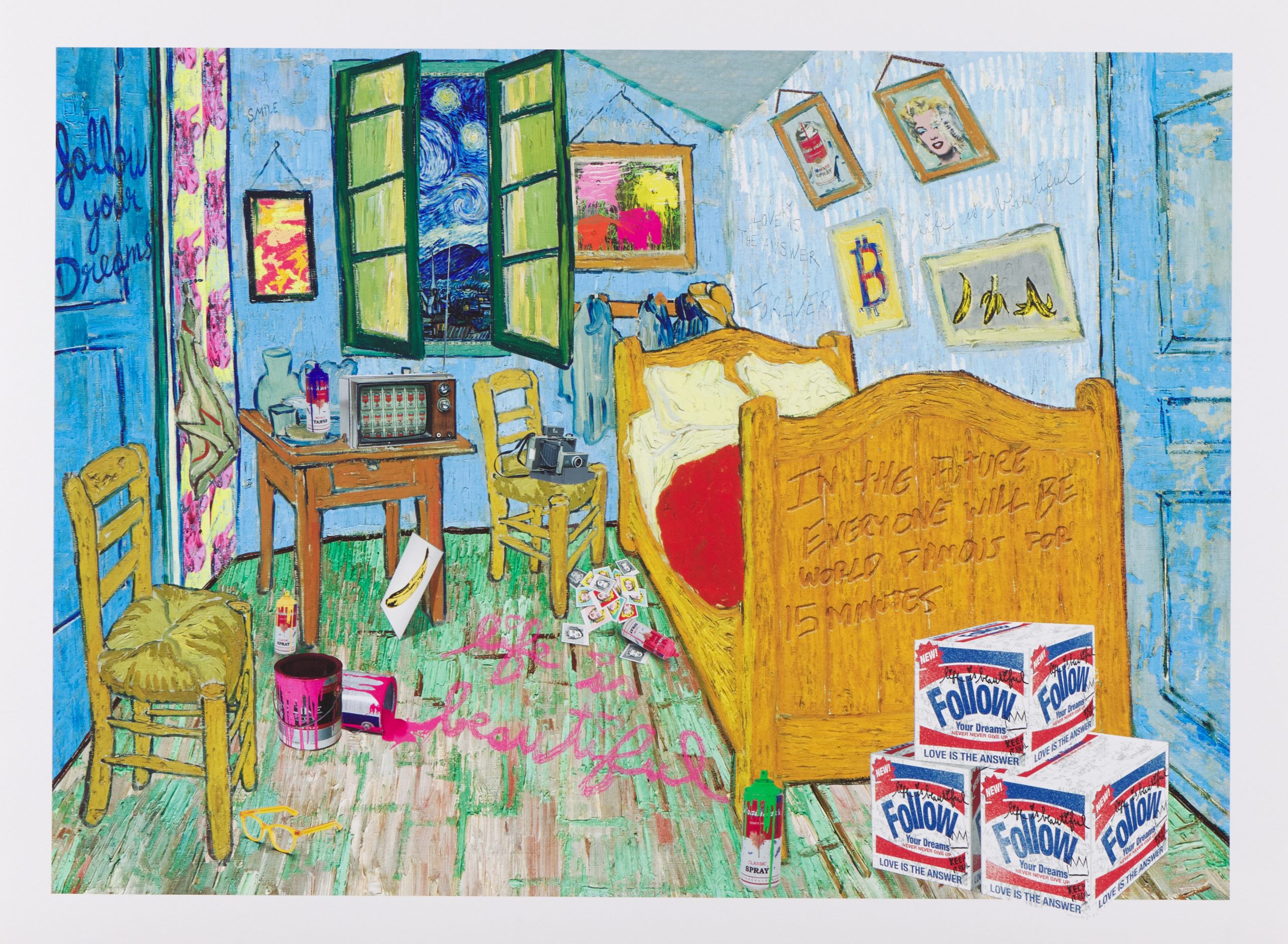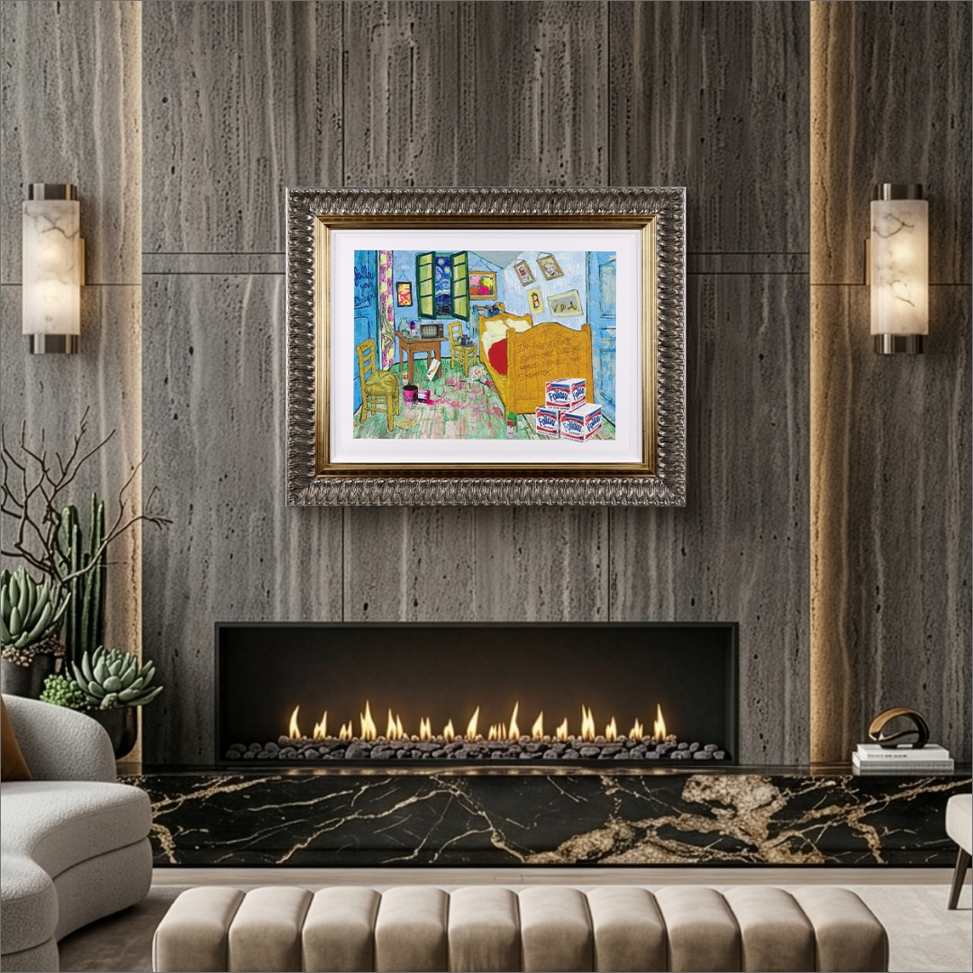 Once Upon a Dream by Mr Brainwash offers a playful and imaginative reinterpretation of one of Vincent van Gogh’s most recognisable interiors. Presented as a silkscreen paper edition, the artwork revisits the famous bedroom scene while layering it with Mr Brainwash’s signature pop-art interventions, graffiti-style elements and vibrant colour. Through the open window, the swirling sky of Starry Night appears beyond the room, creating a clever visual dialogue between two of Van Gogh’s most iconic works. The interior itself is filled with unexpected contemporary touches and artistic references, transforming the historic composition into a lively creative playground. With an image size of 109.5 x 89cm, this stunning contemporary artwork has a bold visual presence while retaining the intimate charm of the original scene. Limited to an edition of 95, Once Upon a Dream celebrates imagination, artistic freedom, and the enduring influence of Van Gogh’s visionary world.