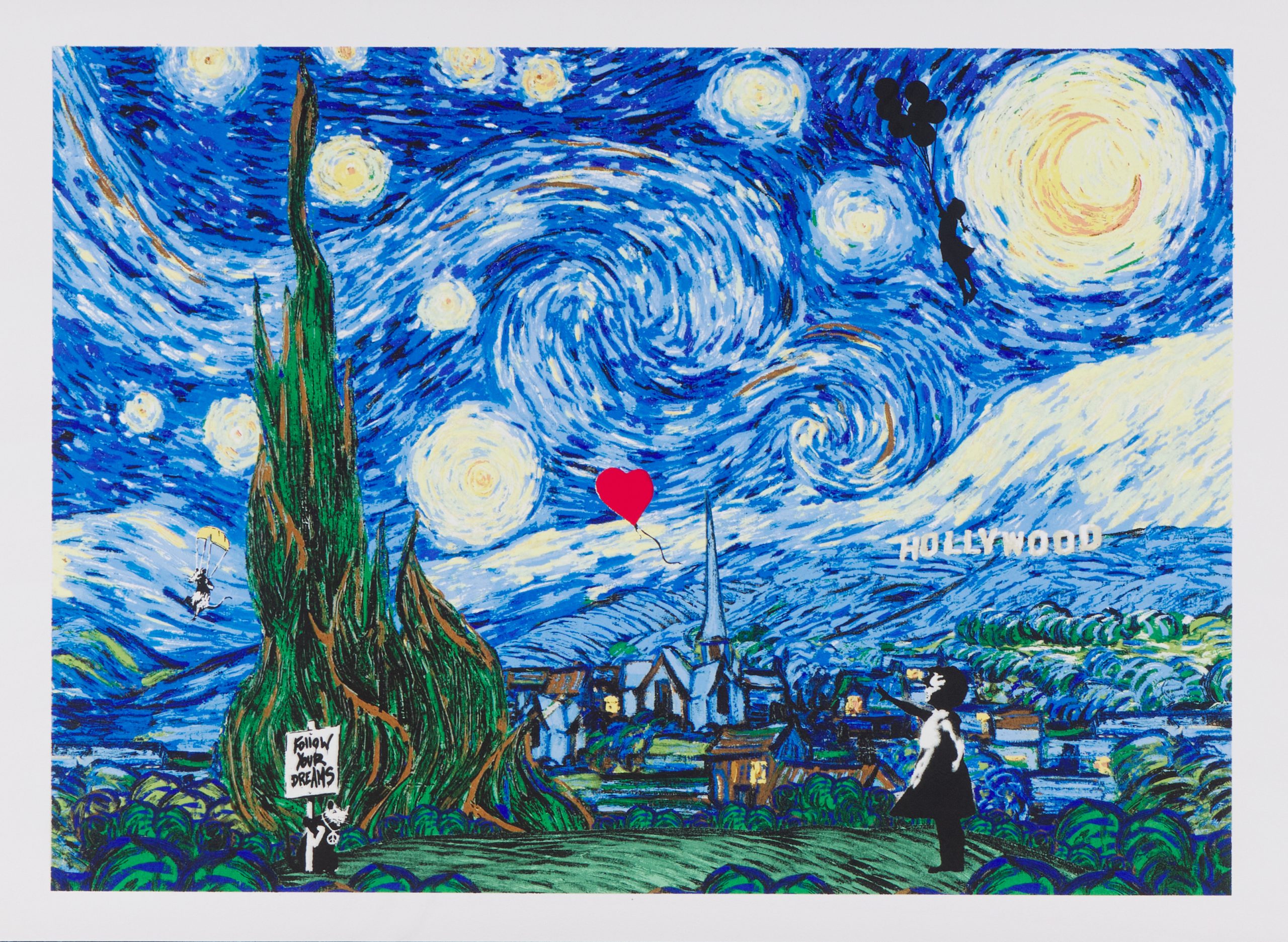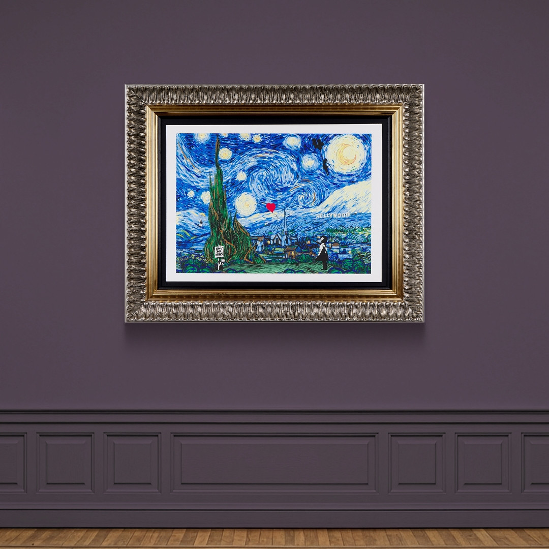 Starry Nights, Hollywood by Mr Brainwash is a bold silkscreen paper edition that playfully reimagines Vincent van Gogh’s iconic Starry Night through the lens of contemporary pop culture. Set against the swirling skies and expressive landscape inspired by the original masterpiece, the composition introduces unexpected modern references, including the unmistakable Hollywood sign rising from a Provençale hillside. The result is a combination of time and place, where the poetic landscape of Provence meets the spectacle of Los Angeles. Mr Brainwash’s layered colours and energetic textures amplify the movement of the night sky while adding subtle contemporary details that reward closer inspection. With an image size of 109.5 x 89cm, the artwork offers a dramatic and immersive composition, beautifully finished in an ornate frame. Limited to an edition of 95, Starry Nights, Hollywood is a playful and irreverent homage that celebrates the enduring influence of Van Gogh while reimagining his world through a distinctly modern lens.